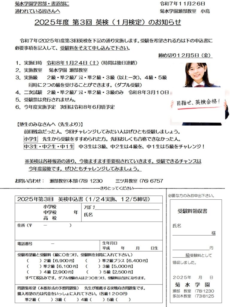 英検申込開始しました。 今回は申込期間が短いため、ご迷惑をおかけしますが、 奮ってご参加下さい。メールまたはお電話で受け付けいたします。