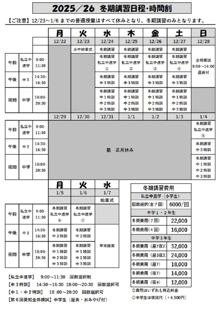 2025年~2026年の冬休み中の冬期講習を以下の通り行います。